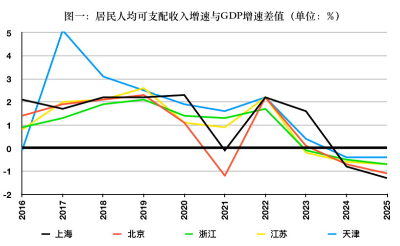 但�年,数据走势迎来拐点。如图一,�年开始,最富五地的居民收入与GDP增速差值开始快速下滑,2024、2025年差值均为负值,这意味着居民收入增速连续低于GDP增速。